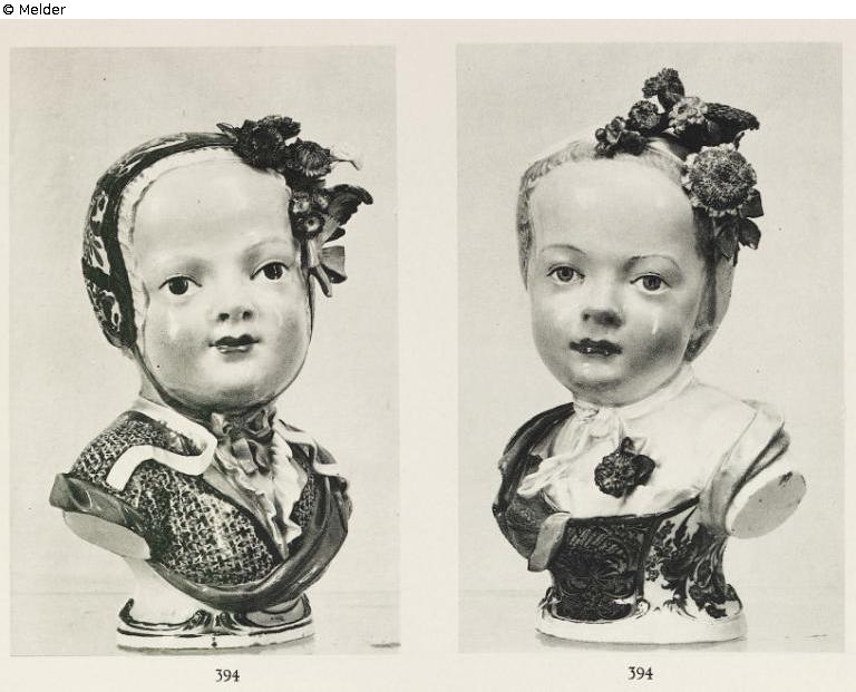 Both with their flowers on the head. A) Robe with purple rosette pattern. Blue cloth. Indian flower on the bonnet. B) Dress with large colorful and purple flowers, yellow and green cloth. White hat. Swords brands. Minor repairs. See Berling, Festschrift