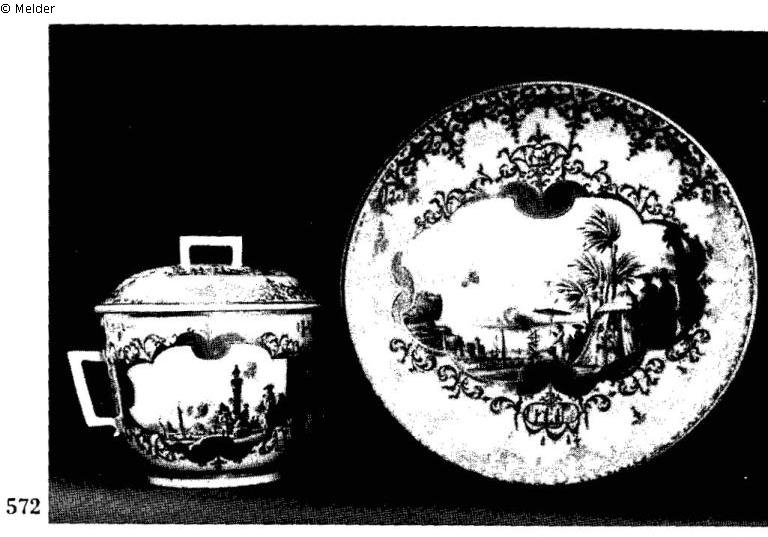 Marke blaue Schwerter über Glasur, Gold 8 (Bouillontasse); Marke große blaue Schwerter, Gold 8 (Untersatz). Die Bouillontasse hat zwei Henkel im chinesischen Stil und leicht gewölbten Deckel mit ähnlichem Griff. Ein goldenes Band umspannt die Basis. Zwei Reserven auf der Bouillontasse, eine in der Mitte des Untersatzes. Die Reserven sind polychrom mit exotischen Hafenszenen, türkischen Figuren und Palmen bemalt. Sie sind durch ein zartes eisenrotes, purpurnes und goldenes Ornament gerahmt, mit Feldern mit Böttger-Lüster. Der Deckel ist mit zwei ähnlichen Landschaftsvignetten bemalt. Die Kartusche auf dem Untersatz enthält eine monochrome Miniatur mit Chinoiserien im Innern eines Ornaments. Der Deckel und der Rand des Untersatzes ist mit goldenen Ornamentenbändern bemalt; Quelle: The Wark Collection. Early Meissen Porcelain. Jacksonville 1986. Katalognummer 572.