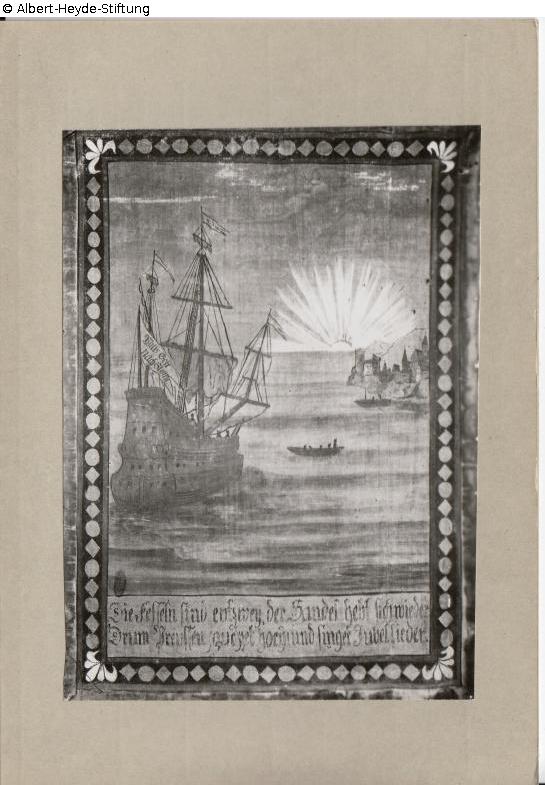 Panel painting in paper frame: Arrival of an allegorical sailing ship (galleon) before a radiant rising sun. Motto on the flag at the stern: ‘Wills Gott nach Stettin’. Below the scene is the caption: „Die Fesseln sind entzwey, der Handel hebt sich wieder. / Drum Preussen jauchzet hoch und singet Jubellieder.“