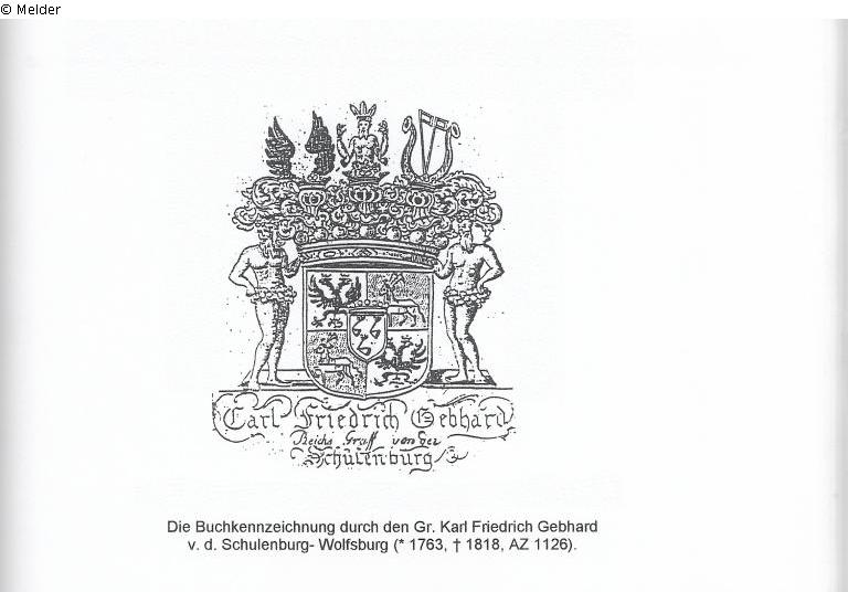 According to Ursula Gräfin von der Schulenburg-Wolfsburg, née Freiin von Dincklage (* 1905, † 1951), the grandmother of Günther Graf von der Schulenburg, the legal successor to the then owner of Neumühle Castle and its inventory, a selection had to be made as to which items could be taken with them and which had to be left behind due to the lack of transport capacity when leaving Neumühle Castle in flight before it was taken over by the Red Army. Among the cultural goods left behind were the volumes from the castle's own historic library.