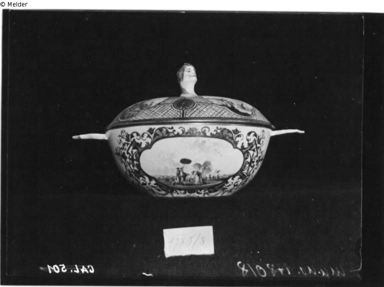 Muller & Cie: Terrine, klein, mit zwei flachen Griffen, auf Untersatz. Polychromes Dekor mit Kartuschen, in denen Ansichten von Häfen der Levante. Goldene Rahmung und Bordüren. Der Knauf als Kopf einer Frau geformt (restauriert). Marke gekreuzte Schwerter in blau. Sammlung Dr. Franz Oppenheimer. Handschriftliche Marginalie: 1900,-