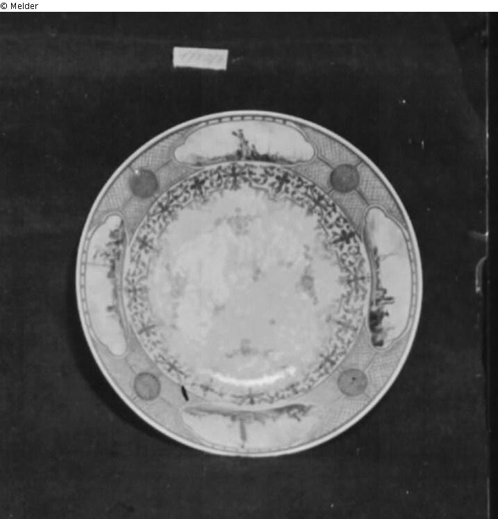 Schnorr von Carolsfeld: Niedrige runde Form. Zwei horizontal angesetzte Griffe mit erhabenem Rand und reliefierter Fünffingerpalmette, goldstaffiert. Gewölbter Deckel mit übergreifendem, vergoldetem Wulstrand und farbig- staffiertem Frauenkopf als Knauf. Untersatz in flacher Tellerform. Auf der Wandung der Terrine zwei breite, golden konturierte Vierpaßkartuschen, umrahmt von reichem goldenem Laub- und Bandelwerk mit Lüsterfeldern, purpurnem Laubwerk und Tuchgehänge. Zwischen den Kartuschen je ein aufsteigender Zweig indianischer Blumen in Lichtblau, Blaugrün, Eisenrot, Purpurviolett und Zitronengelb; In den Bildfeldern: a) Bunter Seeprospekt mit Segelschiffen am Horizont; rechts vorn, auf erhöhtem Ufer, schloßartiger Bau zwischen Palmen; im Vordergrund ein Segelschiff, Gondeln und Chinesenfiguren. b) Bunte Landschaft mit weiter Ebene vor bergigem Hintergrund, belebt mit zahlreichen Figuren; vorn chinesischer Fürst mit Begleiter und Knaben als Schleppenträger, ferner ein Chinese in unterwürfiger Haltung. Auf dem Deckel vier golden konturierte Vierpaßfelder zwischen viergeteiltem, goldenern Gittermuster mit goldenen Blütenrosetten auf Lüstergrund. In den Bildfeldern Seeprospekte mit Segelschiffen, vorn Chinesengruppe. Über den Bildfeldern und dem gegitterten Grund goldenes Laub- und Bandelwerk auf Lüster, dazwischen kleine, in Purpur camaieu gemalte Chinesenfiguren in Vierpaßrahmen. Am Rand des Untersatzes, übereinstimmend mit dem Deckel, vierfach geteiltes goldenes Gittermuster mit vier goldenen Rosetten in rundem Lüsterfeld. Darin vier langgezogene, golden konturierte Vierpaßreserven mit bunten Hafenprospekten und Chinesenfiguren. In der Kehle des Spiegels goldene, teilweise lüstrierte Laub- und Bandelwerkbordüre. Im Spiegel und rückseits am Rand indianische Streublumen in Eisenrot, Lichtblau, Seegrün und Gold. Um 1730-35. Schwertermarke. Höhe der Terrine mit Knauf 11.5 cm; Durchmesser 14,4,cm, Durchmesser des Untersatzes 23,9 cm. - Wahrscheinlich von Christian Friedrich Höroldt (Herold), der 1725 von Berlin nach Meißen kam und dort in der Hauptsache "feine japanische Figuren und Landschaften" malte. In den Akten der Meißener Manufaktur erscheint sein Name noch in den 6Oer und 70er Jahren.
