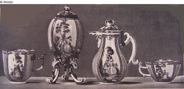 Mehrteiliges Reisefrühstücksservice (Schwertermarke) mit polychromem Watteau- und blauem Schuppendekor, ornamentierte Goldrahmung, bestehend u.a. aus einer ovoiden Kaffeekanne (18 cm) mit Stielgriff und Kranenverschluss auf drei Beinen, einer Teekanne mit Henkel (15 m), einem Milchkännchen, einer Deckeldose und verschiedenen Kaffee- (8 cm) und Teetassen (6 cm) mit Untertassen.