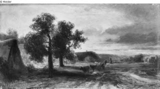 Found-Object Report Two farmhouses under trees with a passing herd of cattle Artist / Creator Schleich, Eduard (der Ältere) Object type Painting Material / TechniqueOil ; Panel (Hardwood) / paintedLost Art-ID606072