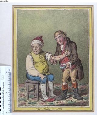 Found-Object Report Breathing a Vein Artist / Creator Gillray, James (published by Hannah Humphrey) Artist / Creator Sneyd, John Object type Print Material / TechniquePaper / printed (etching) colouredLost Art-ID622895