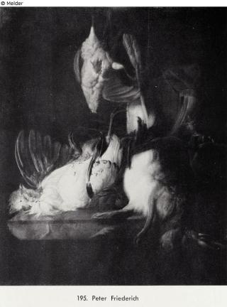 Search Request Still-life of hunting with rabbit, cock and partridge Artist / Creator Friederich, Peter Object type Painting Material / TechniqueOil ; Canvas / paintedLost Art-ID440228