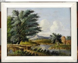 Found-Object Report River landscape with bridge an ruin Artist / Creator Unknown Object type Painting Material / TechniqueOil ; Panel (Oak) / paintedLost Art-ID422141