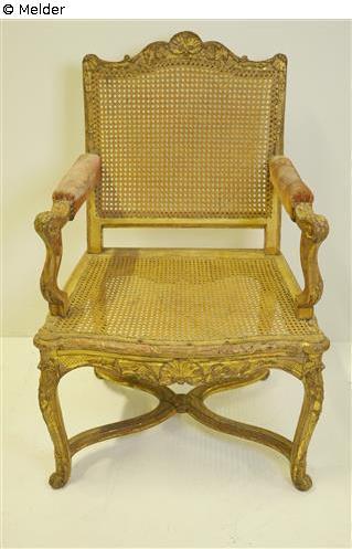 Inventarbuch-Eintrag 3.9.1952: Rokoko-Lehnsessel mit Rohrgeflecht Holzrahmen vergoldet, stark abgeblättert. Obere Lehnenkante, vordere Stuhlkante u. Füsse geschweift. Rahmen mit flacher Holzschnitzerei verziert. Rückseite gepunzt. Beine durch geschwungene flach geschnitzte Stäbe verbunden in der Mitte Rosette. Armlehnen neu gepolstert.
