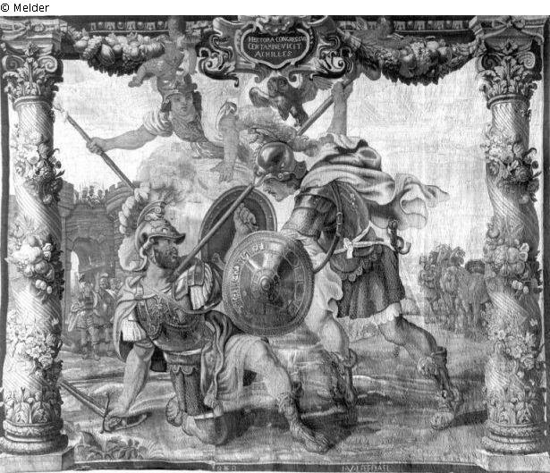 Fundmeldung | Einzelobjekt Achill tötet Hector (Tapisserie: Hektor und Achill) Lost Art-ID219868 Vorherige Weiter Hersteller/Künstler:in Leefdael, Jan van WirkungsortBrüsselErste Erwähnung1644Letzte Erwähnung1656 TitelAchill tötet Hector (Tapisserie: Hektor und Achill) Datierung1660 (um)ObjektartGebrauchs- / RaumtextilieObjektgruppeKunsthandwerk / -gewerbeMaterial / TechnikTextil (Wolle) ; Textil (Seide) / Bildwirkerei Höhe 340,00 cm Breite 418,00 cm Inventarnummermü44783Beschreibung Tapisserie (Bildteppich); Signatur v. Leefdael; Brüssel um 1660 - Athena über dem kämpfenden Achill, der gerade dem Hektor den Speer in die Brust bohrt. Oben Kartusche mit Inschrift, rechts und links gedrehte Säulen mit Blumen. Weiterlesen Weniger anzeigen Bestand Kulturgüter aus dem ehemaligen ReichsvermögenVeröffentlicht seit2001 Kontakt Kunstverwaltung des Bundes Herbert-Bayer-Straße 5 13086 Berlin Deutschland E-Mailprovenienzforschung@kvdb.bund.deHomepagehttp://www.kunstverwaltung.bund.de