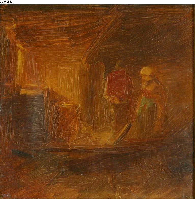 Motiv: In einem schemenhaft dargestellten niedrigen Raum steht zur Rechten ein bäuerliches Paar. Der Mann trägt eine rote Jacke und einen braunen Hut, die Frau eine grüne Schürze über ihrem Kleid sowie ein helles Tuch als Kopfbedeckung. Links im Hintergrund leuchtet hell eine nicht näher ausgeführte Lichtquelle. Werkvz.-Nr. Gm 357.