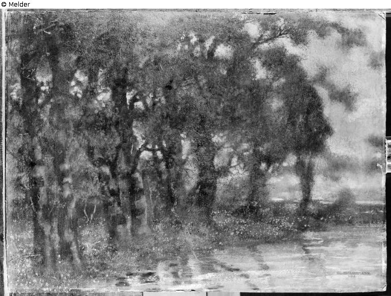 Rückseite: Pappe aufgedoppelt auf Sperrholzplatte, auf der Rückseite mittig oben in Bleistift "M.No 31960", unten links Etikett BStGS: "Inv. Nr. 12932", auf dem Rahmen oben links ein achteckiges Etikett mit mehrfacher schwarzer Umrandung darauf handschriftlich: "Abendstimmung N. 4" mit Kugelschreiber mehrfach durchgestrichen und mit weißer Kreide ausgekreuzt. Daneben das gleiche Etikett, das ein anderes überklebt. Da das obere Etikett fettig ist, scheint des überklebte Etikett durch. Dieses untere Etikett ist quadratisch und trägt einen runden Stempel in dessen Mitte eine bayerisches Wappen mit Krone sitzt und um das umlaufend geschrieben ist: "GERICHTSVOLLZIEHER ... MÜNCHEN". Das obere achteckige Etikett hat keine Schrift mehr, allerdings sieht man noch Spuren vom Auskreuzen.