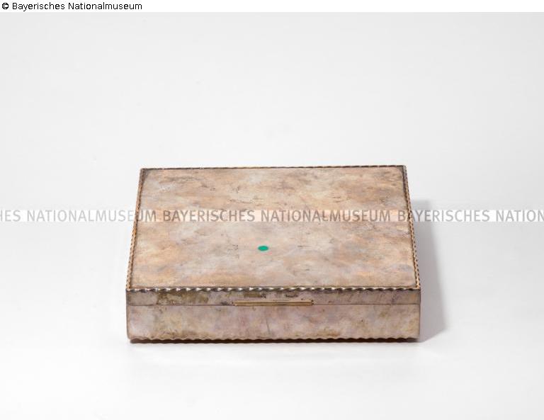 Befund: Auf der Zarge in Schreibschrift eingraviert "Margherita", wohl ein Firmenname. Mit etwas Abstand auf der Zarge daneben eingepunzt Feingehaltszeichen für Sterlingsilber "925" im ovalen Schild. Auf dem Deckel ein grüner Papierklebepunkt. Auf der Rückseite handschriftlich mit schwarzer Farbe "76/31" (Inventarnummer des Bayerischen Nationalmuseums).