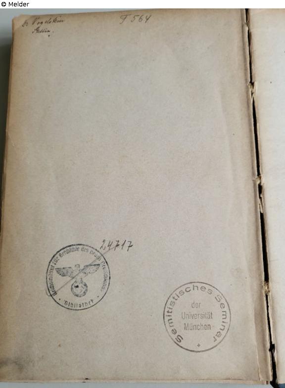 Handschriftlicher Besitzeintrag: Dr. Vogelstein, Stettin (wahrscheinlich ursprünglich aus dem Besitz von Heinemann Vogelstein (1841-1911), der Rabbiner in Stettin war. Er vererbte seine Bücher wohl an seinen ältesten Sohn Hermann Vogelstein, der 1938 emigrierte, wobei er seine gesamte Bibliothek zurücklassen musste