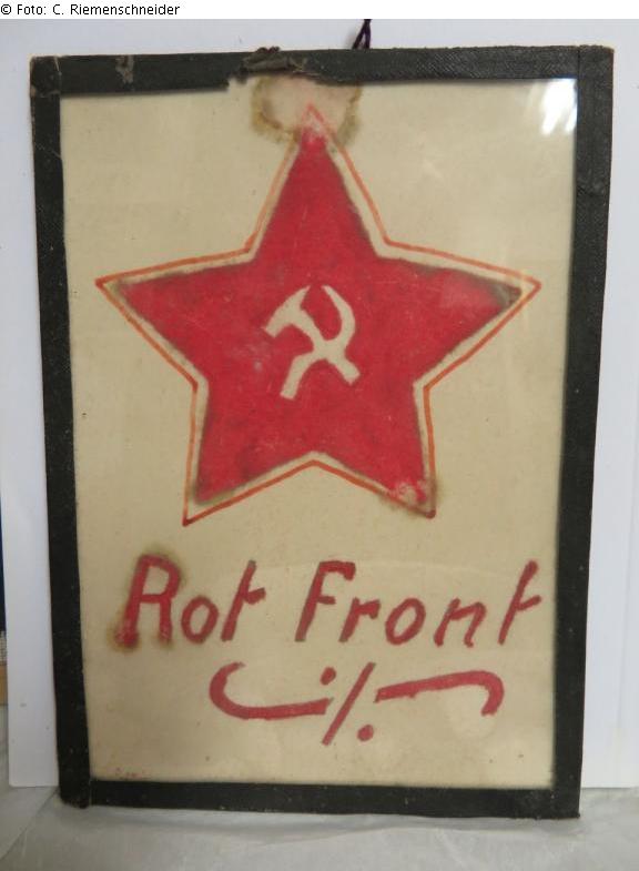 Einfache Zeichnung/Malerei auf Papier, hochrechteckiges Format; hinter Glas mit Gewebeklebeband gerahmt. Zentral die Zeichnung eines Sowjetsterns, ausgefüllt in roter Farbe. Ausgespart im Zentrum des Sterns die Umrisse von Hammer und Sichel. Unter dem Stern, ebenfalls in roter Frabe, der Schriftzug "Rot Front". Auf der Rückseite ist mit Bleistift ein Hakenkreuz an der Stelle gezeichnet, an der der rote Stern von der Vorderseite durchscheint.