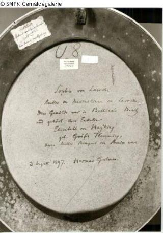 (zeitweilige) Verwaltung; Berlin; (öffentliche) Sammlung; Staatliche Museen zu Berlin - Preußischer Kulturbesitz; Gemäldegalerie; Zugangsart: zur Bergung ausgehändigt; Zugangsdatum: 16.09.43; Katalogtext: Unbekannt: Unter dieser Rubrik wurden sowohl in der Gemäldegalerie (Ost) als auch in der Galerie Dahlem Bilder verzeichnet, deren Einlieferungsdatum und -herkunft völlig unbekannt sind. Es kann sich wie bei den unter "Priv" verzeichneten Stücken sowohl um solche aus eingelagertem Privatbesitz als auch um begonnene und nicht abgeholte Restaurierungsaufträge oder liegengebliebene Kopistenarbeiten handeln. Geismeier, Fremdbesitz, 1999, S. 67 Katalogtext: Galerie-Akten: Dem Staatsminister von Raumer wird unter dem 16. 09. 43 von Galeriedirektor Zimmermann eine Empfangsbestätigung über zwei Bilder zur Bergung "in unseren Luftschutzräumen" ausgehändigt. Als Nr. 2 wird o.g. Bild verzeichnet. Spätere handschriftliche Notiz "Nr. 1 von den Russen abgegeschleppt.Z" Am 09. 11. 1946 Nachfrage des Intendanten Martin, Hebbel-Theater Berlin im Auftrag von Hans von Raumer nach den Bildern. Kein Beleg einer Antwort vorhanden. Vgl. die Liste der Gemäldegalerie vom 30. 11. 1950 "2 d. Sonstige Bilder aus fremdem Besitz, Raum XIII, Aus Privatbesitz, eines davon Eigentumsbezeichnung Fr. V. Raumer". Herkunft: unbekannt? Geismeier, Fremdbesitz, 1999, S. 69 f.
