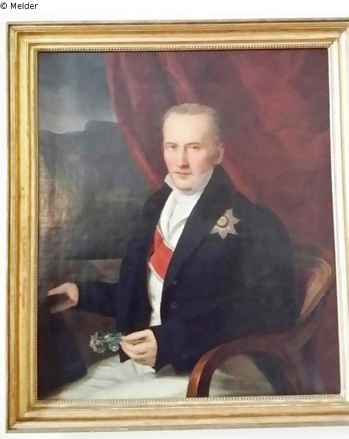 Herr in mittleren Jahren sitzend im Lehnstuhl, mit schwarzer Gehrockjacke, weißem Hemd und heller Hose. Unter der Jacke auf dem Hemd eine rote Schärpe, an der Jackeeinen großen Stern. Im Hintergrund Möbel und halb geschlossener roter Samtvorhang.