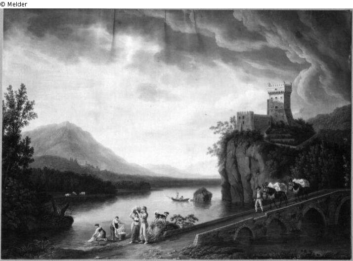 Castell am See mit Brücke und Staffage