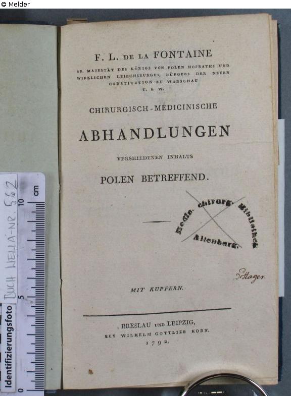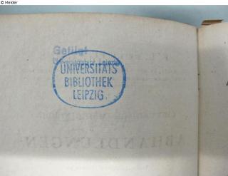 auf dem Titelblatt in Schwarz, ca. 24 x 45 mm, mit Bleistift durchgestrichen: Medic. Chirurg. Bibliothek Altenburg; verso Stempel in Blau: Getilgt Universitätsbibl. Leipzig; darüber ovaler Stempel: Universitätsbibliothek Leipzig
