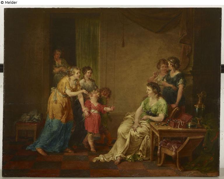 Cornelia in einem Interieur sitzend. Ihr werden ihre Söhne gebracht