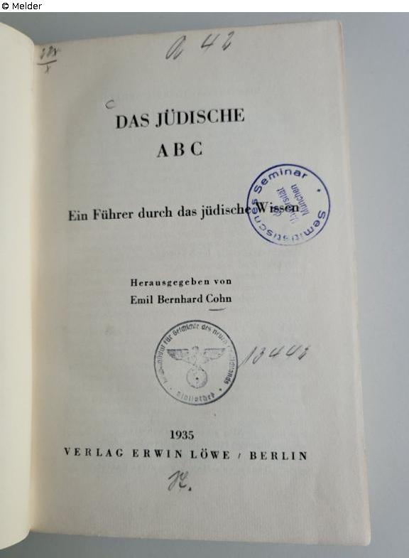 Fundmeldung | Einzelobjekt Das jüdische ABC. Ein Führer durch das jüdische Wissen Lost Art-ID632669 Vorherige Weiter Autor:in Cohn, Emil B. Verlag Löwe TitelDas jüdische ABC. Ein Führer durch das jüdische WissenErscheinungsortBerlin Erscheinungsdatum1935ObjektartBuchObjektgruppeBibliotheksgutSignatur1207/Ha 30Beschreibung Stempel „Reichsinstitut für Geschichte des neuen Deutschlands“ (A42/13442 ). Weiterlesen Weniger anzeigen Veröffentlicht seit28.10.2025 Kontakt Ludwig-Maximilians-Universität Institut für den Nahen und Mittleren Osten Bibliothek Veterinärstr. 1 80539 München Deutschland Tel0049-89-2180-3039Homepagehttps://www.naher-osten.uni-muenchen.de/institut/bibliothek/index.html Ansprechpartner:in Prof. Dr. Ronny VollandtPositionProfessor für JudaistikE-Mailronny.vollandt@lmu.de
