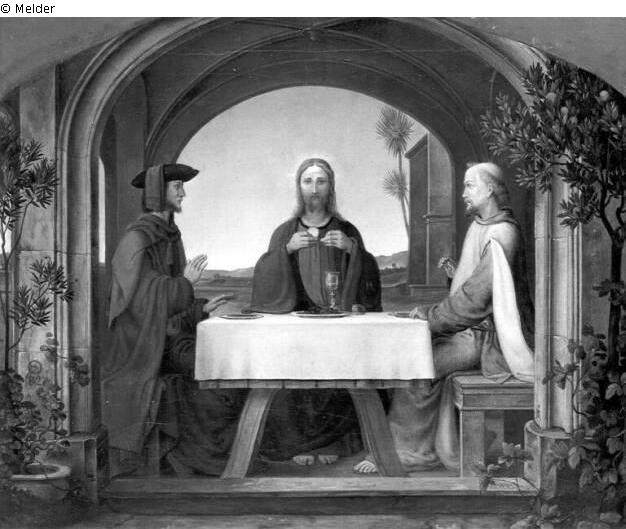 Am gedeckten Tisch in einer Bogenhalle, durch die man in südl. Landschaft blickt, sitzt Christus, in der Hand die Hostie, vor ihm ein Kelch. Rechts und links die beiden Jünger. Rechts und links davon Bäume mit Früchten.