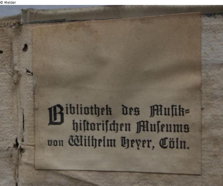 Etikett: " Bibliothek des musikhistorischen Museums von Wilhelm Heyer, Köln"; Stempel: "Musikwissenschaftliches Institut der Universität Köln"; handschriftliche Inventarnummer: " 11,137";