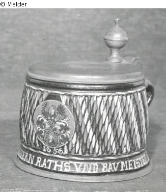 Fundmeldung | Einzelobjekt Deckelkrug Lost Art-ID219498 Vorherige Weiter Hersteller/Künstler:in Unbekannt (Deutsch) TitelDeckelkrug Datierung1656ObjektartGefäßObjektgruppeKunsthandwerk / -gewerbeMaterial / TechnikKeramik (Ton) ; Metall (Zinn) Höhe 11,00 cm Inventarnummermü2438/28Beschreibung Blau-Weiß-Braun-Malerei mit Gold. In der Mitte Wappen 1656. Unten Inschrift: "Philipp Seyboth des innern Raths und Baumeister zu Rotenburg". Weiterlesen Weniger anzeigen Bestand Kulturgüter aus dem ehemaligen ReichsvermögenProvenienz Zugang 1944 Weiterlesen Weniger anzeigen Veröffentlicht seit2001 Kontakt Kunstverwaltung des Bundes Herbert-Bayer-Straße 5 13086 Berlin Deutschland E-Mailprovenienzforschung@kvdb.bund.deHomepagehttp://www.kunstverwaltung.bund.de
