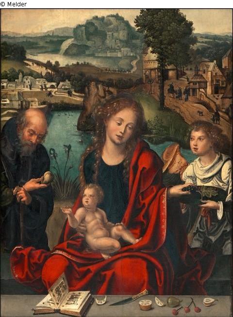 Die Heilige Familie mit einem Engel, der Maria eine Traube reicht