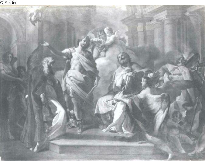 Fundmeldung | Einzelobjekt Die Hl. Hippolyt, Taurinus und Herculanus, die Martyrer von Portu (Triumph von drei Heiligen) Lost Art-ID565985 Vorherige Weiter Hersteller/Künstler:in Giaquinto, Corrado Geburt 1699?, Molfetta Tod (um) 1765, Neapel WirkungsortTurin; Rom TitelDie Hl. Hippolyt, Taurinus und Herculanus, die Martyrer von Portu (Triumph von drei Heiligen)ObjektartGemäldeObjektgruppeMalereiMaterial / TechnikÖl ; Leinwand / gemalt Höhe 142,00 cm Breite 191,00 cm Inventarnummermü7522Beschreibung In der Mitte Krieger, rechts von ihm zwei Engel mit Kranz. Links alter Priester, rechts sitzender Heiliger und Engel mit Palmzweig. Weiterlesen Weniger anzeigen Bestand Kulturgüter aus dem ehemaligen ReichsvermögenVeröffentlicht seit05.01.2017 Kontakt Kunstverwaltung des Bundes Herbert-Bayer-Straße 5 13086 Berlin Deutschland E-Mailprovenienzforschung@kvdb.bund.deHomepagehttp://www.kunstverwaltung.bund.de