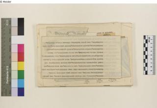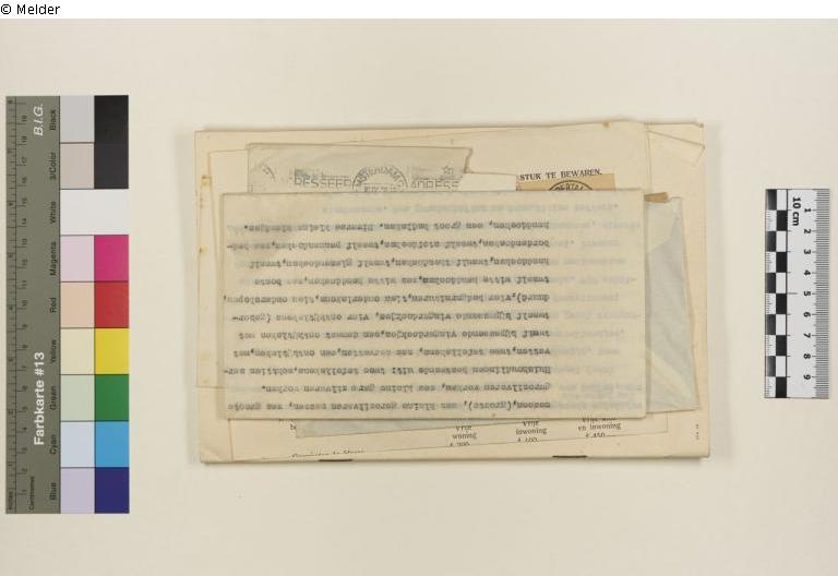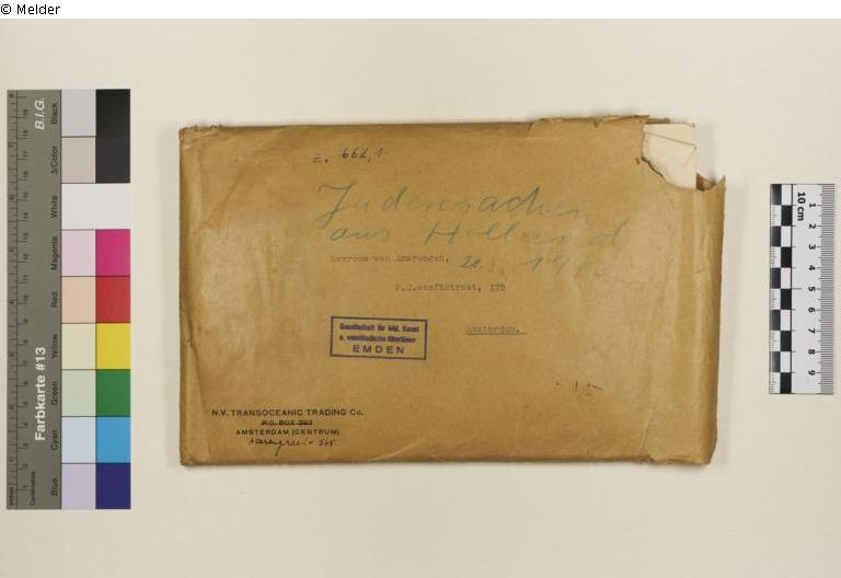 Darauf Beschriftung in Kugelschreiber mit „66d,1“ (Nachkriegsmarkierung), handschriftlich mit blauem Buntstift ist groß „Judensachen aus Holland 20.3.1943“ zu lesen (vermutlich von einem der Täter angebracht), Ein rechteckiger Stempel mit dem Schriftzug „Gesellschaft für bild. Kunst u. vaterländische Altertümer EMDEN“, Adressiert an „Mevrouw van Amerongen, P.C.Hoofstraat, 173 Amsterdam.“, Absendeadresse: „N.V. TRANSOCEANIC TRADING Co. P.O. BOX 393 AMSTERDAM (CENTRUM)“ handschr. Ergänzt durch „Herrengracht 565.“ [Anm.: Auf niederländisch würde es Herengracht heißen; Es ist daher anzunehmen, dass eine deutschsprachige Person diese Änderung vorgenommen hat.]