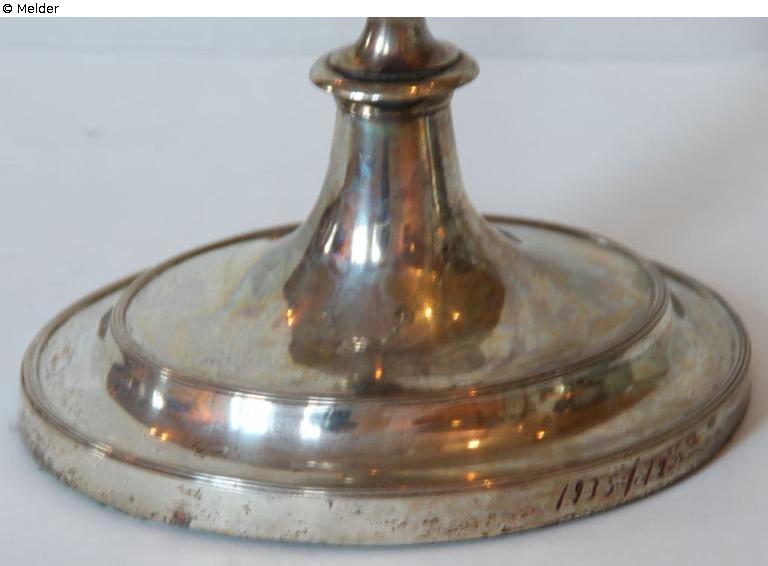 Der große, dreiflammige Leuchter steht auf einem profilierten, ovalen Fuß, der einen mehrfach abgesetzten, sich konisch leicht nach oben erweiternden Balusterschaft trägt. Auf dem Schaft sitzt ein Kelch, der einen kleinen, tellerförmigen Aufsatz mit drei Leuchterarmen trägt. Die schlanken, glatten Leuchterarme umwinden zunächst mehrfach ein zentral im Aufsatz stehendes, pokalförmiges Zierstück und schwingen dann in einer weiteren Windung nach drei Seiten aus. Jeder Leuchterarm trägt eine runde Traufschale mit einer nach oben geöffneten, vasenförmigen Tülle für das Licht. Auf der Kante des Fußes einpunktiert: 'P.H.' (kursiv); auf dem Kelch des Schaftes: 'N:2', gehört zusammen mit Objekt Inv. Nr. 1935,126