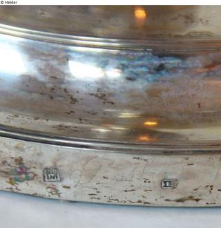 unter dem Mittelstück des Einsatzes: 'N:3' (verbessert aus '6') (punktiert)", auch auf dem Fuß: Beschauzeichen Hamburg und Meisterzeichen von Johann Hues (IH in einem Rechteck).