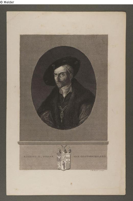 Inhaltlich zeigt der Stich ein Brustbild im Oval eines etwas hageren, schielenden Mannes mit kurz gestutztem Kinn- und Schnauzbart, der sehr asymmetrische Gesichtszüge aufweist. Er trägt einen dunklen Mantel mit Pelzkragen sowie ein Tuch am Kopf und darüber ein zeitgenössisch typisches Samtbarett mit Schmuckapplikationen. Auf der Brust sitzt eine schwere Kette mit Anhänger. Unter dem Oval befindet sich ein Sockel sowie in dessen Mitte ein Wappen. Das Wappen gleicht dem ostfriesischen nur bedingt. In einem Schild oben links eine Harpye, oben Mitte ein Adler, oben rechts zwei liegende Halbmonde über einer Mauer über einem liegenden Halbmond, unten links ein aufrechtstehender Löwe, unten Mitte ein stehender Bär, unten rechts zwei gekreuzte Fahnenstangen. Links des Wappens ist in Versalien zu lesen „Edzard II, Graaf“ und rechts davon „van Oost-Friesland“. Der Stich ist signiert mit „J. W. Kaiser sculps.“