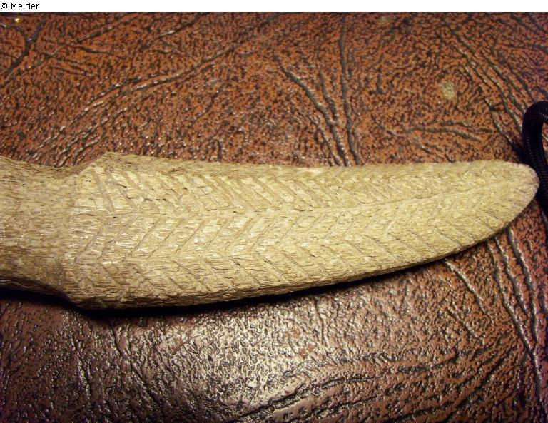 Dolch als Ziergegenstand, keine scharfen Klingen; Form insgesamt gebogen; Griff in etwa genauso breit und lang wie die Klinge; am Übergang von Griff zu Klinge zieht der Griff etwas ein; am Ende des Griffes plastische Verzierung: Kopf eines Tieres (Löwe?); Griffoberseite glatt; Klinge annähernd spitz zulaufend, aber Spitze abgerundet; Klingenoberseite mit Ritzmuster verziert: rechts und links neben zentraler Linie Fischgrätmuster; Rückseite des Griffes und der Klinge ohne Unterbrechung glatt und mit ein bzw. zwei zentralen durchlaufenden Graten