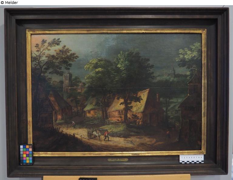 Über die von der Mitte des unteren Bildrandes nach links verlaufende, sich zweimal nach rechts verzweigende Dorfstraße mit herannahendem zweirädrigem Pferdekarren mit Fuhrmann, fällt der Blick in der Bildmitte auf zwei diagonal stehende Bauernhäuser, deren Strohdächer unter den hohen Baumkronen der davorstehenden beiden Bäume hell aufleuchten und seitlich auf zwei Landschaftsausblicke mit bewaldetem Höhenrücken und zwei Burgen. Im Mittelgrund des hinteren Bilddrittels drei weitere Bauernhäuser, am rechten Bildrand als Bildabschluss ein weiteres Bauernhaus.