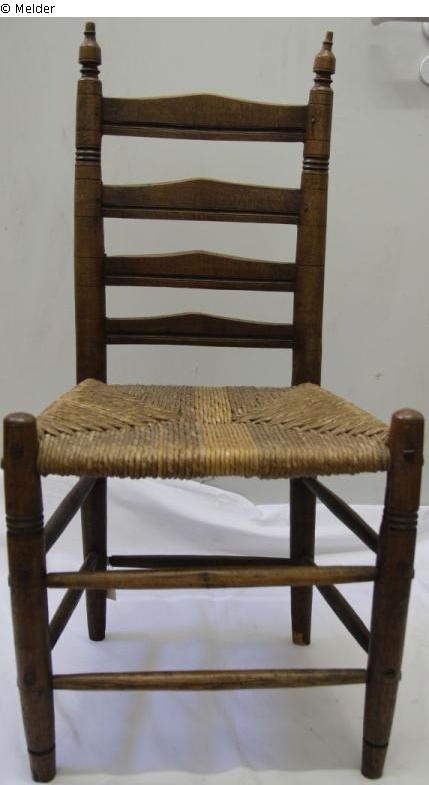 gedrehte Beine, allseitig mit 2 runden Sprossen verstrebt, an der Rückenlehne 4 geschweifte Sprossen. Sitz trapezförmig, aus Reet geflochten