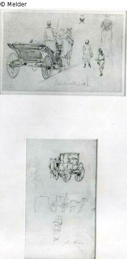 Oben Kutsche nach halblinks hinten, darunter weitere Kutsche und Frau mit Kiepe.