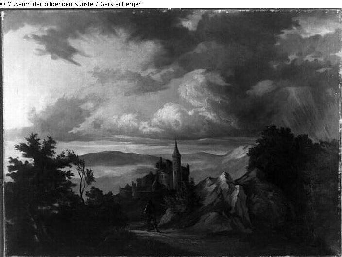 Unbezeichnet; Rückseitenbefund: auf dem Rahmen l. Mitte/unten: ¿696 X¿ [es folgen drei Worte handschriftlich in Sütterlin mit Bleistift, unleserlich], l. Mitte/oben Aufkleber: ¿Nr. [gedruckt] 1322 (Museum) [handschriftlich mit Bleistift] / Ferdinand Ernst Oehme [mit dunkler Tinte] / ¿Burg unter Gewittersturm¿ [mit dunkler Tinte]¿, l. u.: [min. drei Worte handschriftlich in Sütterlin, unleserlich], o. r. gedruckter Aufkleber: ¿K.H. / 391¿, o. Mitte/rechts gedruckter Aufkleber: ¿GEORG ULRICH / KUNSTGEWERBLICHE WERKSTÄTTE / VERGOLDEREI / MÜNCHEN / TEL: 24457 / BARERSTR. 52¿