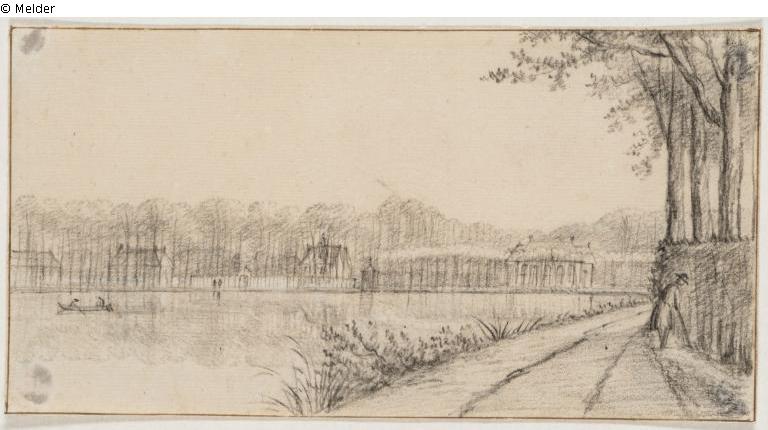 Rechts hohe Bäume und eine Figur; Bäume auf einem gemauerten Plateau; Boot mit zwei Figuren auf dem See