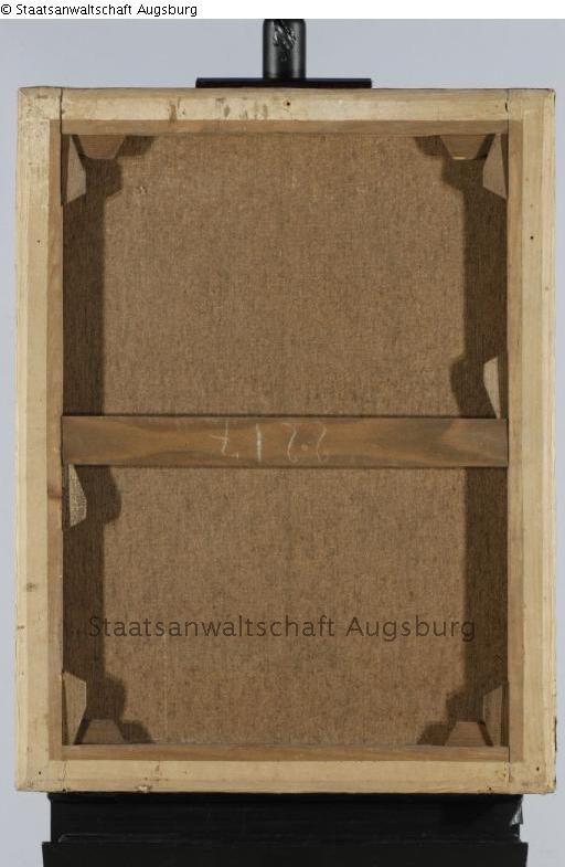 Keilrahmen: verso, mittig in Rot, überdeckt mit Kaschierband: „[unlesbar]“; Mittelstrebe, in Rot: „2[?]7154[oder "9"] [unlesbar]“, darüber in weißer Kreide: „2217”.