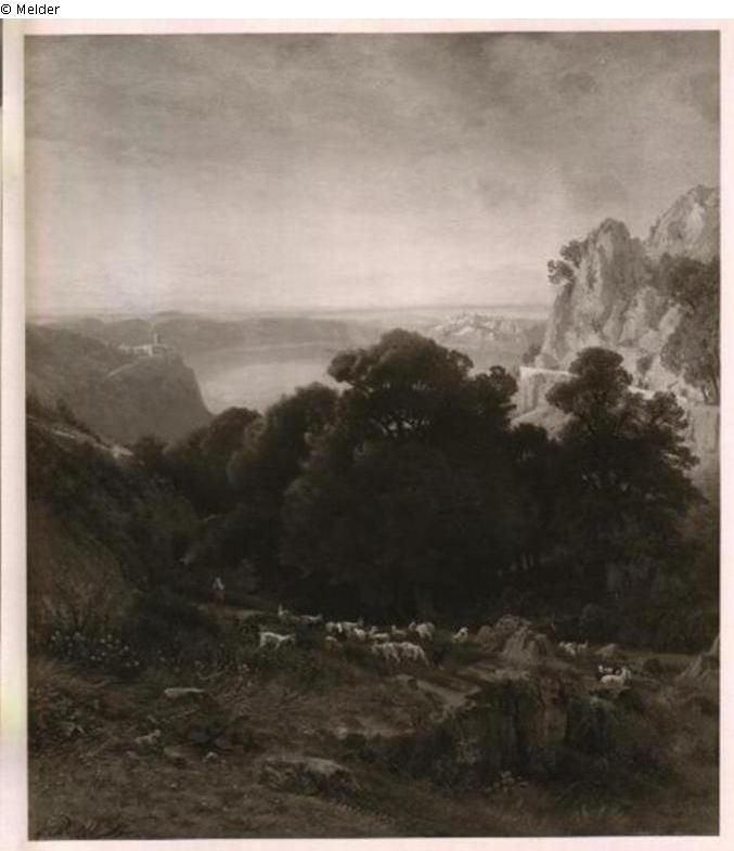 Fundmeldung | Einzelobjekt Italienische Landschaft mit See und Ziegenherde im Vordergrund Lost Art-ID531400 Vorherige Weiter Hersteller/Künstler:in Rodde, Carl Gustav Geburt 1830.08.29, Danzig Tod 1906.03.01, Berlin-Großlichterfelde WirkungsortBerlin TitelItalienische Landschaft mit See und Ziegenherde im Vordergrund Datierung1880ObjektartGemäldeObjektgruppeMalereiMaterial / TechnikÖl ; Leinwand / gemalt Höhe 127,00 cm Breite 104,00 cm InventarnummerMü. 11332; aa 1812Beschreibung Blick von oben auf die Wiese mit den Ziegen, dahinter eine Baumkulisse die den See verdeckt. Links Burg, rechts hohe Felsen. Weiterlesen Weniger anzeigen Veröffentlicht seit23.12.2015 Kontakt Bundesamt für Auswärtige Angelegenheiten Kirchhofstraße 1-2 14776 Brandenburg Deutschland E-MailI-AU-RL@bfaa.bund.de