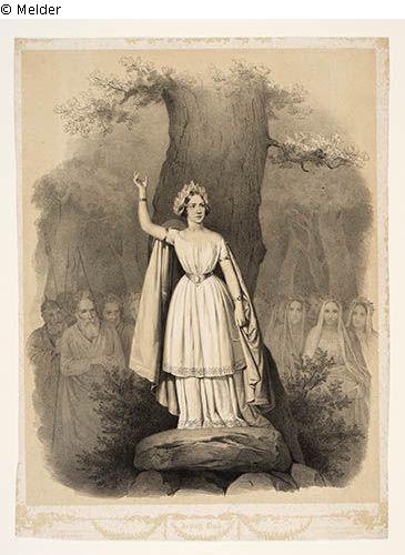 Die Priesterin Norma steht frontal vor einer Eiche. Sie hat einen Arm erhoben, in der anderen Hand hält sie eine Sichel. Im Hintergrund sind Novizinnen und Römer aufgereiht.
