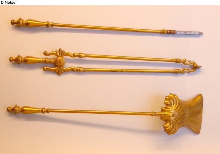 Kupfer mit Messing überzogen; Griffstücke spindelförmig, Kaminzange und Schaufel: florales Dekor. Kaminschaufel: Schaufelstiel und Schaufelblatt vernietet, Schaufelblatt am Rand konkav geformt. Schüreisen: Eisenspitze, obeliskenförmig, Länge: 11,5 cm - 70,5 cm