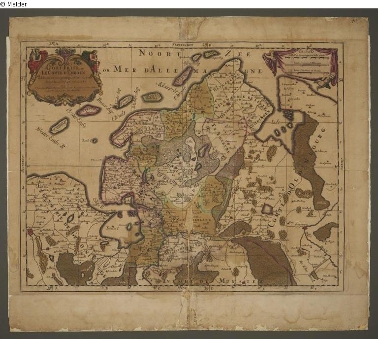 Karte „Oost-Frise, ou Le Comté d‘Embden subdivisé en ses principals Iurisdictions“ (Ostfriesland oder die Grafschaft Emden, unterteilt in sechs Gerichtsbezirke)