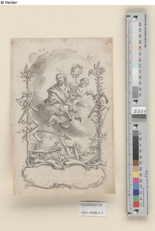 Kartusche mit Brustbild des Hl. Joseph, im Hintergrund Darstellung der Werkstatt