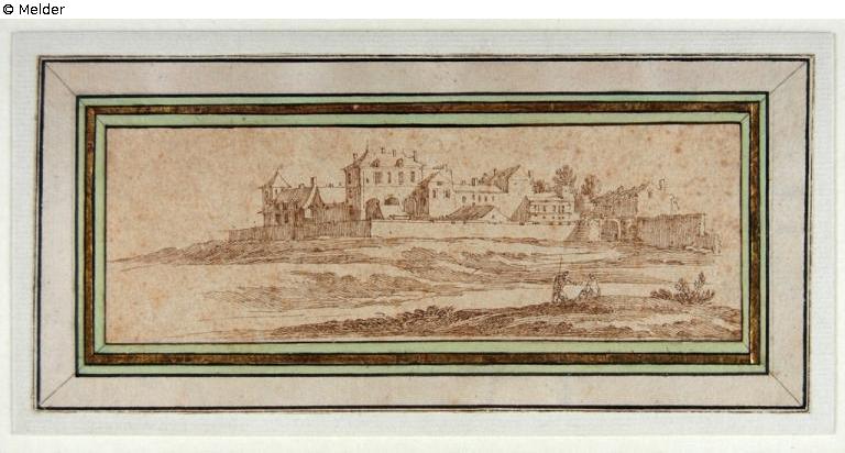 Kastell an einem Fluss, vorn zwei Wanderer