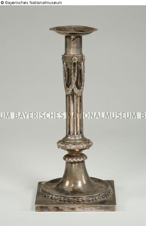 Befund: Auf der Oberseite der Sockelplatte: Meisterzeichen 'GJB (ligiert, kursiv) in Rund', für Gottlieb Johann Biller (Meister 1783, gest. 1797); Beschauzeichen 'Pyr über D in Hochoval', für Augsburg, um 1787-1789. Auf der Unterseite der Sockelplatte: Tremolierstich; handschriftlich mit roter Farbe "39/65" (Inv.-Nr. des Bayerischen Nationalmuseums)./A.G., 2018