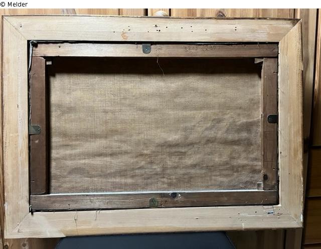 Dargestellt sind im der Bildmitte dörfliche Häuser und eine kleine Brücke über einem Fluss. Im Hintergrund sind weitere Häuser und Berge erkannbar.
