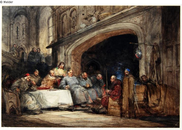 Geistliche Männer an einem Tisch vor einem großen Kamin in einer großen Halle, im Hintergrund eine Treppe mit weiteren Personen
