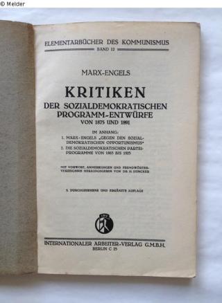 Kritiken der sozialdemokratischen Programm-Entwürfe von 1875 und 1891. (3. durchgesehene und ergänzte Auflage). Reihe: Elementarbücher des Kommunismus, Bd. 12